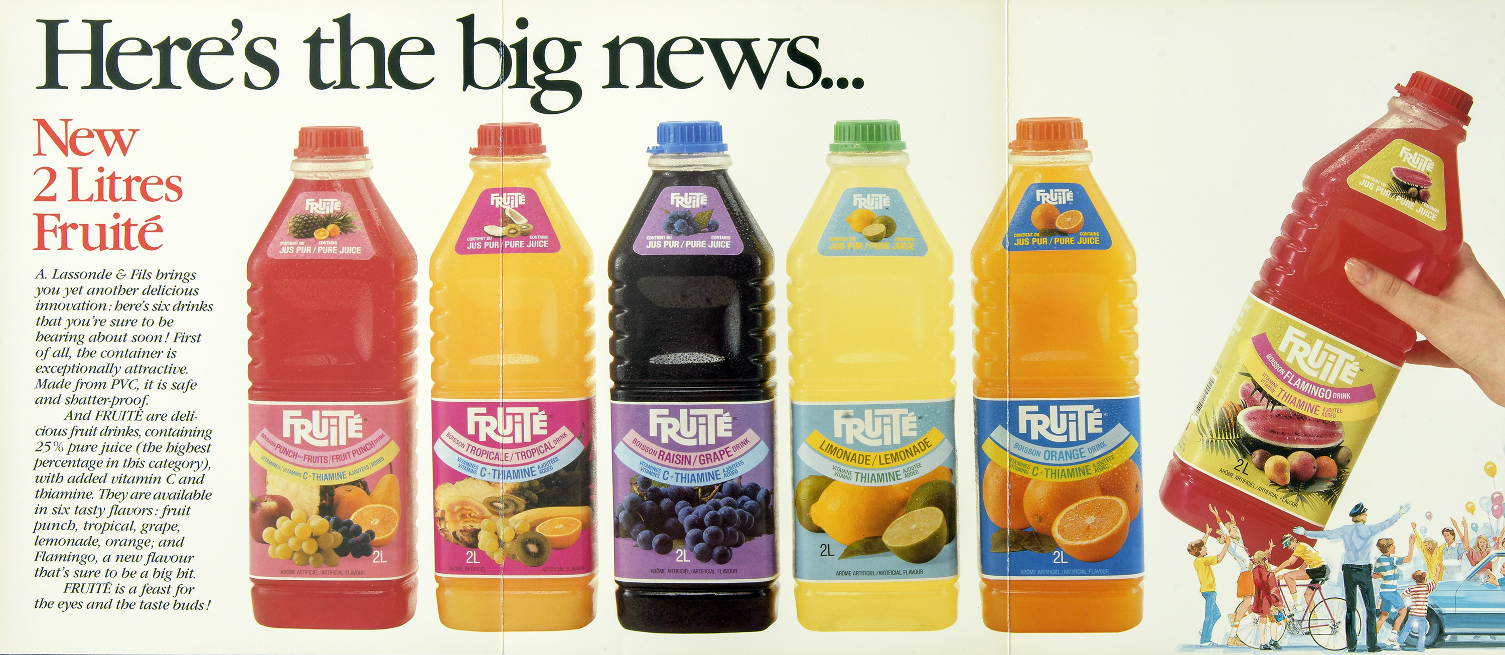 Nearly 25 years after launching its first fruit drinks, Lassonde made quite a splash with its Fruité line. What made it so special? First of all what was in it: at least 25 per cent pure juice – the highest proportion on the market in its category – with added thiamine and vitamin C. And there were six flavours to start: fruit punch, tropical, grape, lemonade, orange and Flamingo – a new exotic flavour. Then there was what wasn’t in it: thanks to aseptic bottling technology, it didn’t contain preservatives such as sodium benzoate used in most plastic bottles.