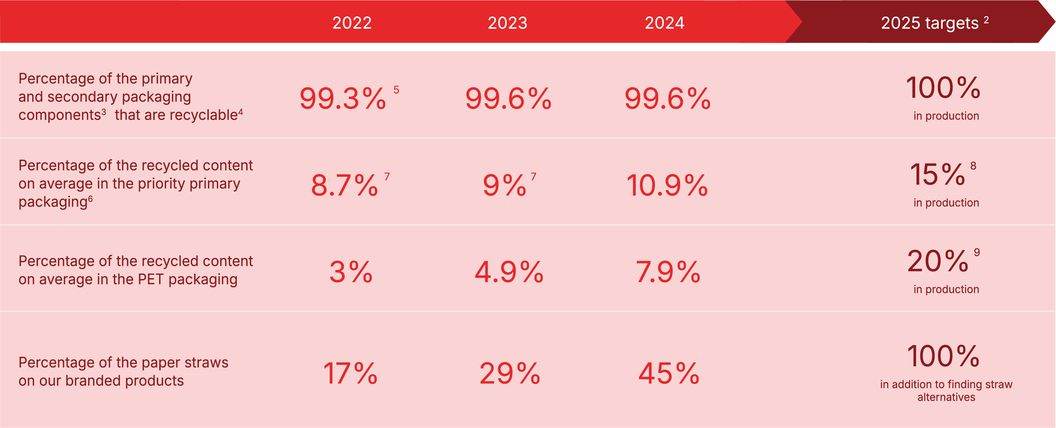 2. Our recyclability and recycled content targets are based on production volumes at December 2025 (rather than on annual purchase volumes) to better reflect our situation at the end of 2025. We report the average percentage of recycled content each year based on annual purchase volumes in order to allow comparison with previous years.