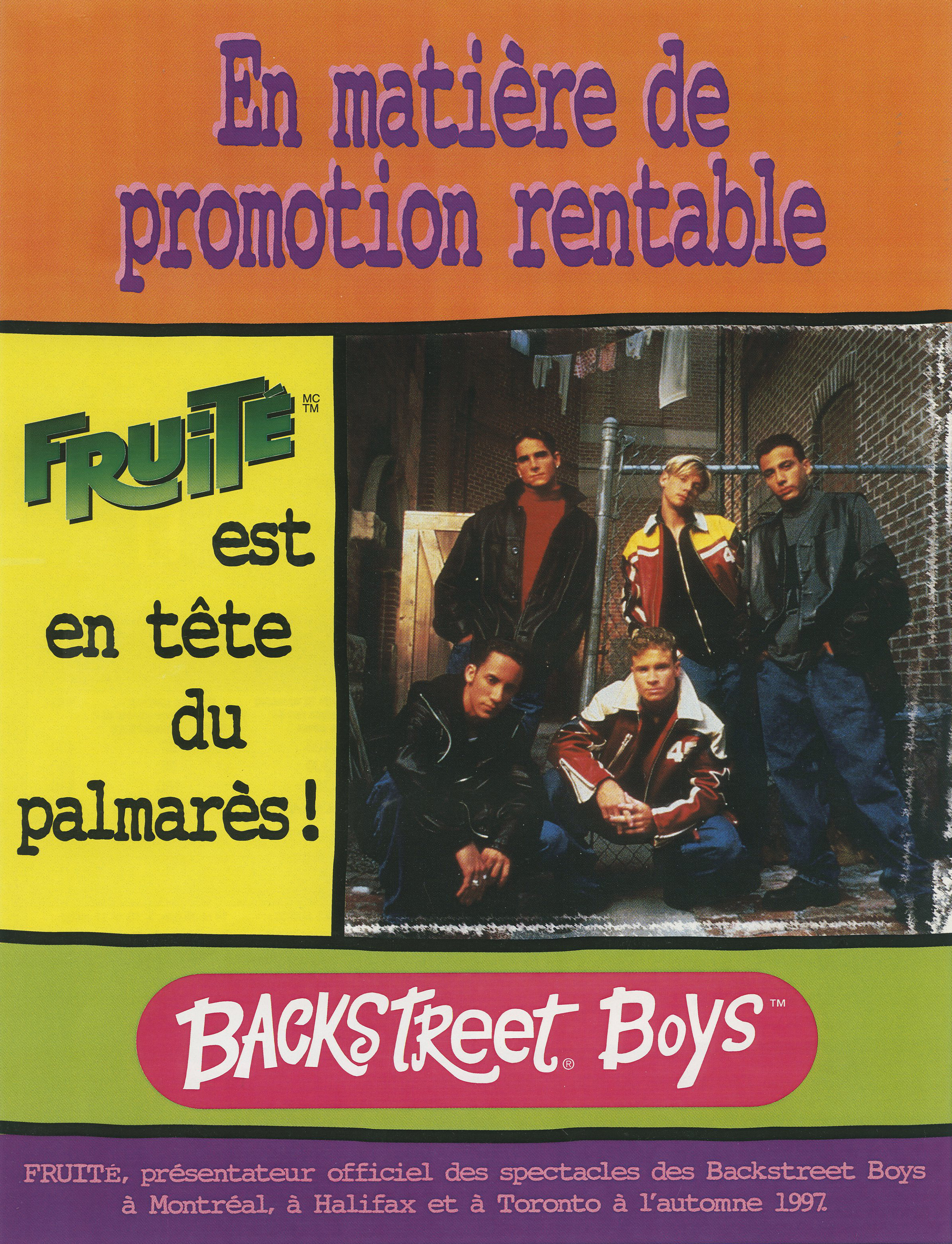 À l’été 1997, au terme de négociations avec le producteur Donald K. Donald, Lassonde devient le présentateur officiel des spectacles des Backstreet Boys au Canada. Une vaste campagne publicitaire et promotionnelle, associée aux boissons de fruits Fruité, est lancée dès le 1er mai : affiche dans les magasins d’alimentation, photos des Backstreet Boys sur plus de deux millions de contenants Fruité de deux litres, annonces télé à Musique Plus et MuchMusic, bulletins de participation au concours. À gagner : billets de spectacle, blousons et t-shirts édition spéciale Fruité – Backstreet Boys et, bien sûr, rencontre exclusive avec le groupe. Et des millions de jeunes de Toronto, Halifax et Montréal sortent du spectacle en chantant We’ve Got It Goin’ On. Tout comme Fruité.
