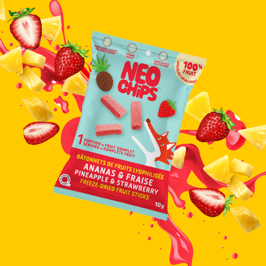 Néo Chips a été fondée par Ellipse Conservation, une entreprise d’économie circulaire dont la mission est de réduire le gaspillage alimentaire. Les collations Néo Chips sont des croustilles de fruits croquantes et nutritives, entièrement fabriquées à partir de fruits frais revalorisés, dont le noyau et la chair auraient autrement été jetés. Des fruits tels que l’ananas, les pommes et les fraises obtiennent leur croquant par un processus de lyophilisation qui permet de préserver 97 % des nutriments du fruit! Au cours de la dernière année, plus de 10 tonnes de fruits ont été valorisés par l’entreprise.
