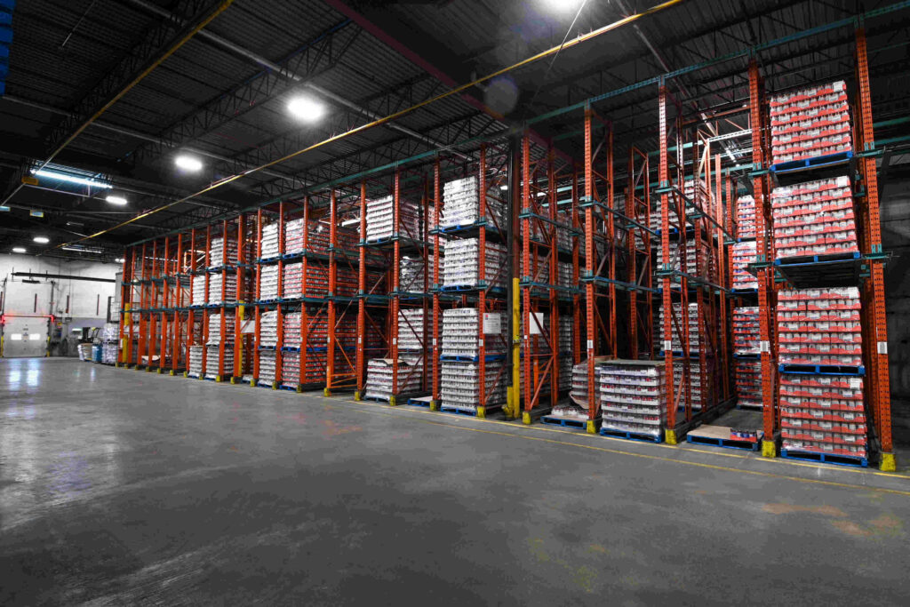 Situé près de notre usine de St-Damase, cet entrepôt d’une superficie de 200 000 pieds carrés comble nos besoins d’entreposage pour nos produits alimentaires.