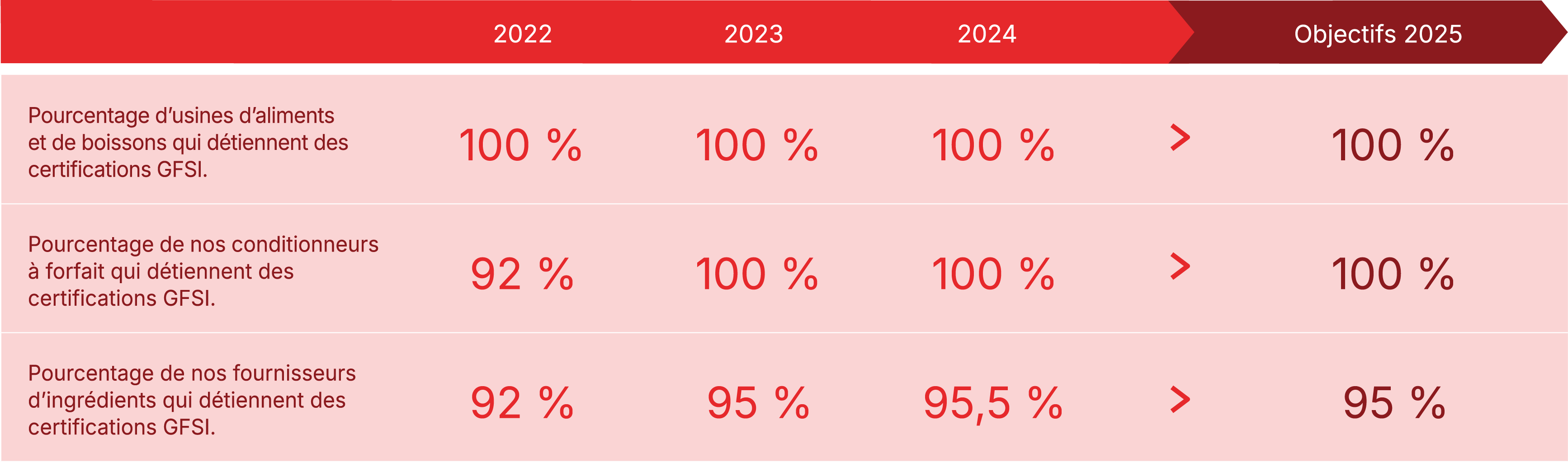 Dépassement de notre objectif de 2025 visant à ce que la proportion de nos fournisseurs d’ingrédients qui détiennent une certification GFSI atteigne 95 %.